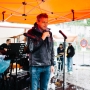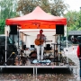 Spontan kriegen wir zum Glück ein zusätzliches Zelt organisiert: eins damit die Künstler vom Bühnenprogramm nicht zu nass werden – das Zelt steht also auf der Bühne – und das Zusatzzelt direkt neben der Bühne, damit auch wirklich alle Instrumente und Bühnenteilnehmer Platz finden.